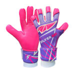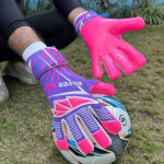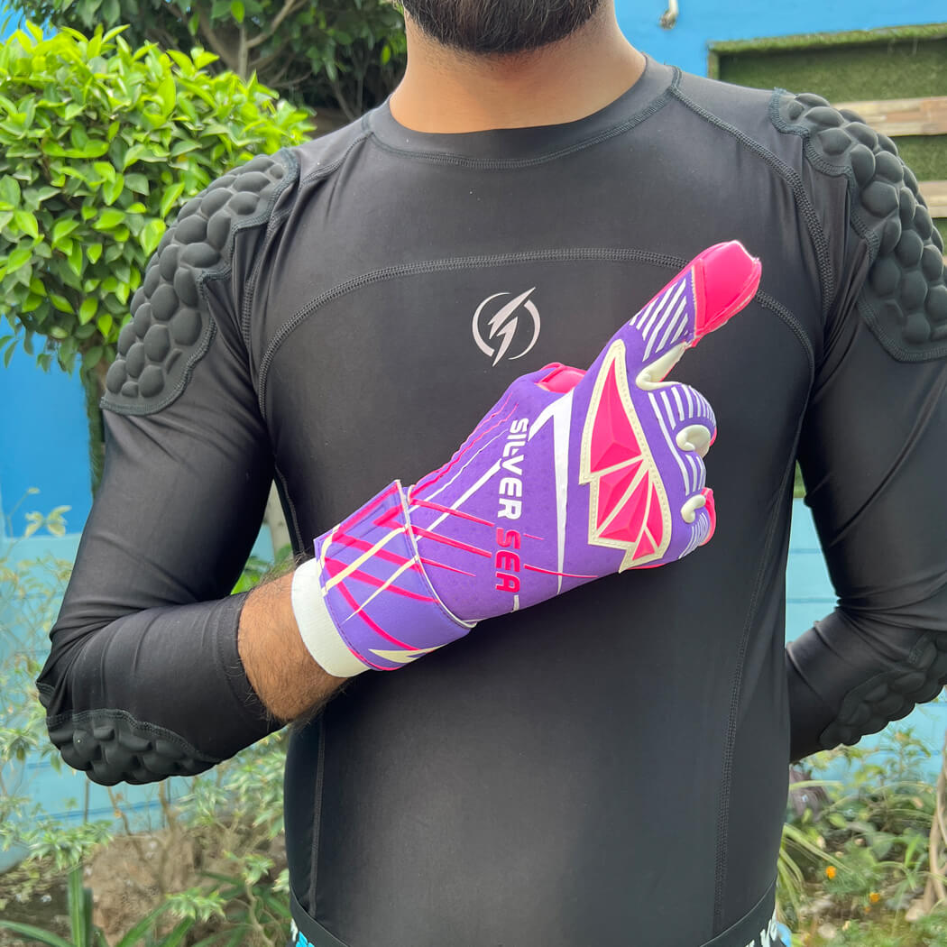 Backhand: special flexible comfortable perforated Neoprene body with silicon printing and 3d latex punch zone